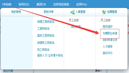 (一)福能集團(tuán)內(nèi)應(yīng)聘人員必須獲得所在單位同意,請(qǐng)通過個(gè)人門戶賬號(hào)登陸福能集團(tuán)企業(yè)門戶:http://10.1.12.15:83/portal,并參照下圖所示路徑進(jìn)入職位申請(qǐng)界面,選擇相應(yīng)的職位在線報(bào)名填寫《應(yīng)聘人員登記表》