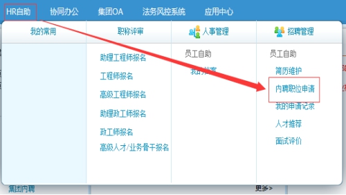 (一)福能集團(tuán)內(nèi)應(yīng)聘人員必須獲得所在單位同意,請通過個(gè)人門戶賬號(hào)登陸福能集團(tuán)企業(yè)門戶:http://10.1.12.15:83/portal,并參照下圖所示路徑進(jìn)入職位申請界面,選擇相應(yīng)的職位在線報(bào)名填寫《應(yīng)聘人員登記表》。